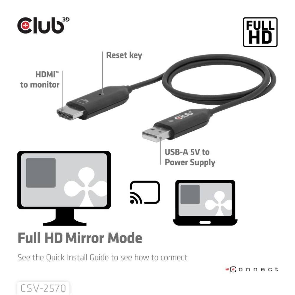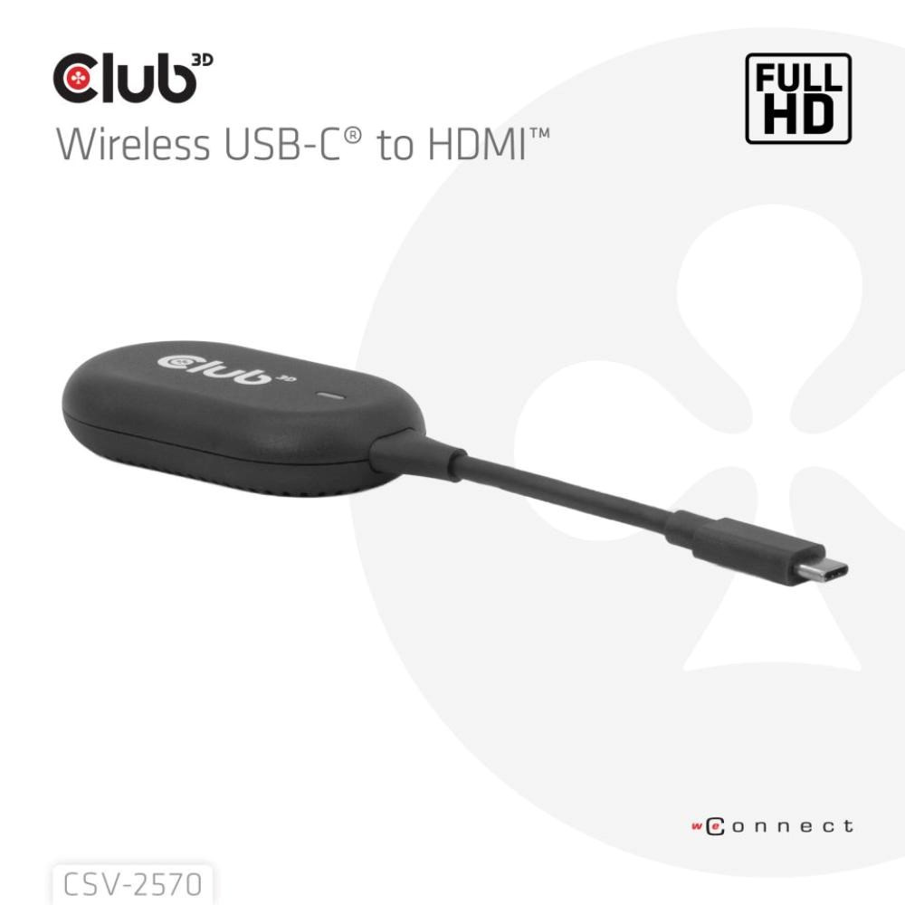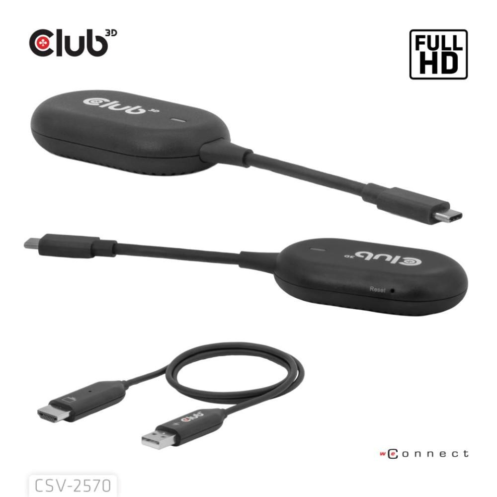 Club 3D CSV-2570 je první bezdrátové zařízení s technologií HDMI. Pomocí vysílače a přijímače bezdrátově přenáší video a zvuk ve FullHD kvalitě z zařízení s USB-C na HDMI displeje.
