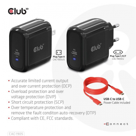 | In the box | • CAC-1905 Travel Charger PPS 65W GAN technology, Single port USB Type-C, Power Delivery(PD) 3.0 Support - Mains connector (Specify on Order) • 1x RED (Power ONLY) USB Type-C cable(1 m / 3.28 ft) for connecting to Host |