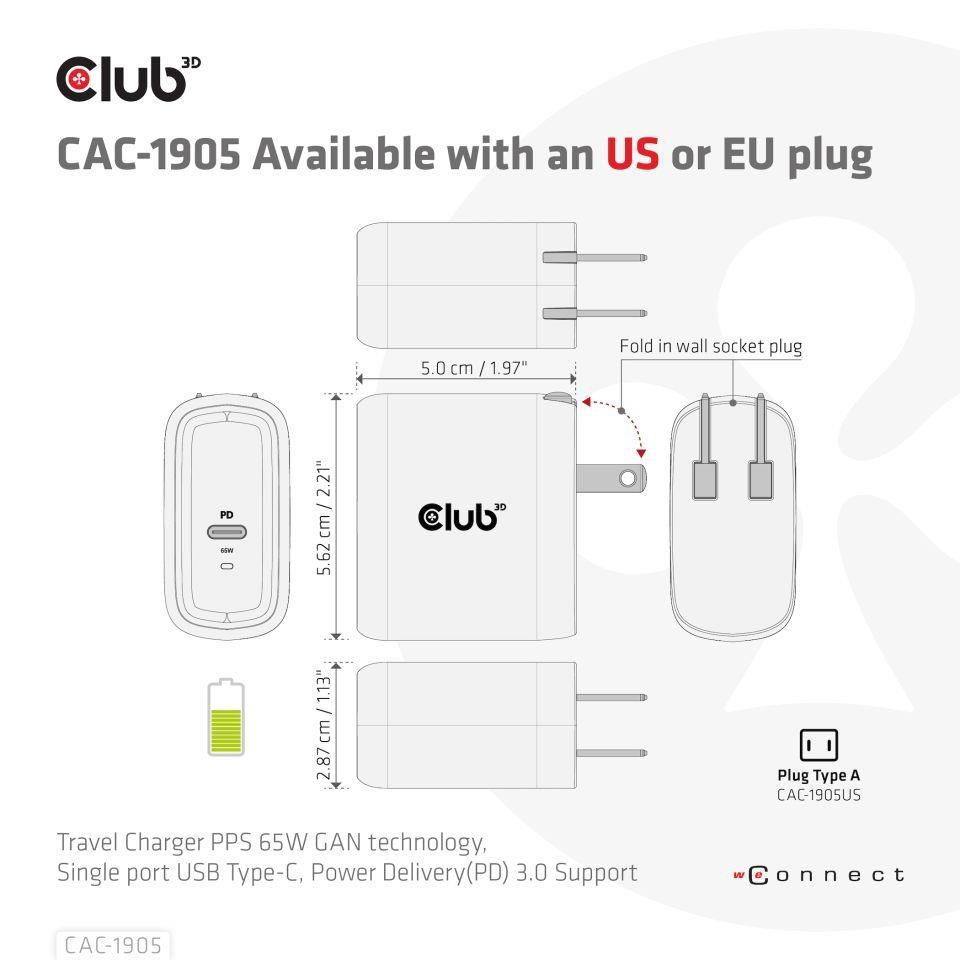 The Club3D CAC-1905 Travel Charger PPS 65W GAN technology, Single port USB Type-C, Power Delivery(PD) 3.0 Support. Compact size & Superior Performance: GAN technology chipset makes this charger 50% smaller than a 65W MacBook chager, small enough to carry anywhere.The Programmable Power Supply(PPS) 65W wall charger match a variety of PD devices from smart phones to laptops, one for all making charging simple. This wide compatibility charger will be your convenient companion during your business trip or vacation.
