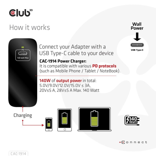 • CAC-1914 Travel Charger 140 Watt GaN technology, Single port USB Type-C, Power Delivery(PD) 3.1 Support