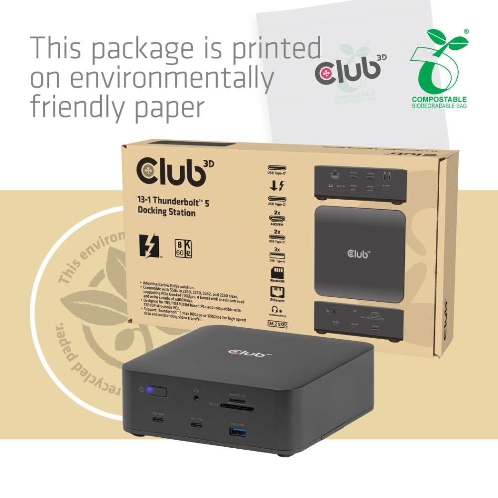 Club3D Dokovací stanice Thunderbolt 5 13v1, 1x M.2 SSD slot, 1xUSB-C TB5, 2xUSB-C,3xUSB-A,2xHDMI,1xmicroSD/SD,1xEthernet