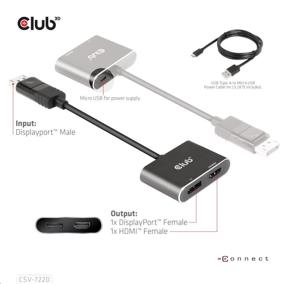 Give your device more displays. PCs and notebooks are increasingly becoming more powerful and smaller in the physical form factor. With a single DP™1.4 port available you can now drive one-Displayport™ screen simultaneously with a HDMI™ screen at 4K60Hz or One DP™ display at 8K30Hz in MST mode Windows). All it needs is a free DP™ 1.4 port on your Laptop or PC to connect to the MST hub and will provide you with unparalleled connection options for Dual 4K60Hz displays. The setup is easy and simple to do, provided your system supports DP1.4 specifications and DSC1.2 Compression, resolutions can be limited if the source device is lower. The CSV-7220 is externally powered by a USB Type-A to Micro USB cable which comes with the product.