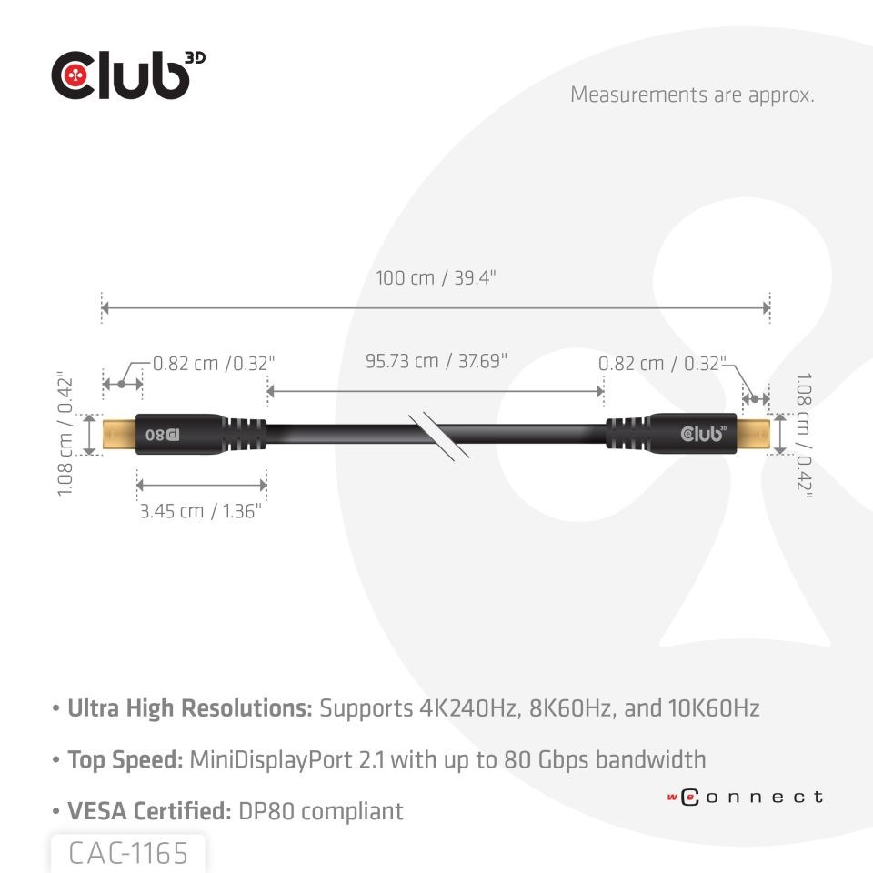 Club 3D CAC-1165 MiniDisplayPort DP80™ koaxiální kabel Certifikovaný kabel Vesa, 4K240Hz, 8K60Hz nebo 10K60Hz 1m umožňuje připojení vašeho (herního) PC nebo notebooku s podporou MiniDisplayPort k monitoru s ultra vysokým rozlišením nebo jinému zařízení s podporou MiniDisplayPort.