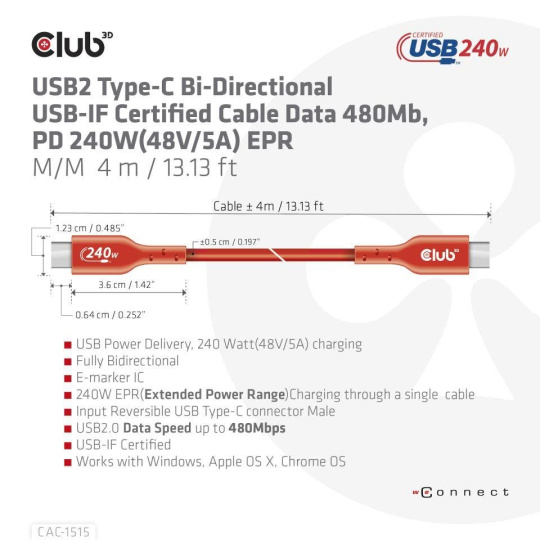 The Club 3D CAC-1515 USB2.0 Type-C Bi-Directional USB-IF Certified Cable, Data 480Mb, PD 240W(48V/5A) EPR, Extended Power Range M/M 4 m / 13.13 ft connects your Notebook, Tablet or Phone with USB Type-C output to your favorite existing Peripherals, Accessories and Chargers. It enables Data and Power over a single cable and both ways. This cable supports USB2.0 data up to 480Mbps and up to 240Watt(48V/5A) output for Downstream charging or powering your Notebook, Tablet or Smartphone.