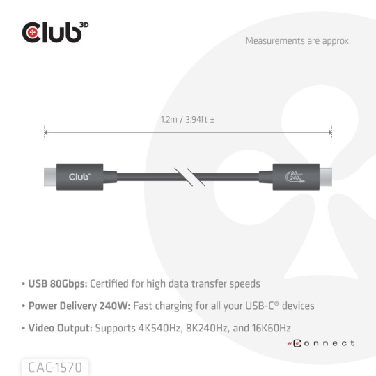 Club3D Kabel USB4 v2 Typ-C, 80Gbps, Certifikovaný kabel, 4K540Hz, 8K240Hz, 16K60Hz, PD 240W, 1,2m