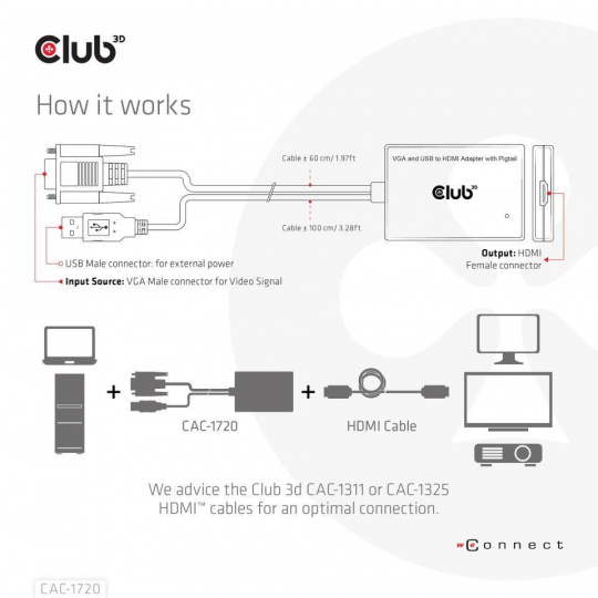 The Club 3D CAC-1720 VGA and USB Type-A to HDMI™ Adapter with Pigtail M/F 0.6m/1.97ft 28AWG links any VGA-equipped desktop, laptop or adapter to a monitor, display, beamer or projector with a HDMI™ Male port. Ideal for at home or work, the adapter creates a reliable connection for anything from gaming to video projection and supports up to Full HD 1080p(max. resolution of 1920 x 1080). An USB Type-A port is also provide for External Power. This quality VGA to HDMI™ cable provides superior performance thanks to the combined effect of its Gold plated connectors and 28 AWG conductors. Internal shielding provides reduced crosstalk, suppresses noise, and helps prevent electromagnetic interference (EMI) and radio frequency interference (RFI).