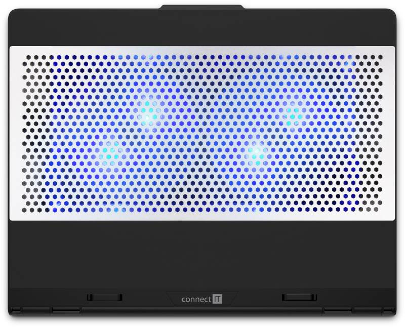 Chladicí podložka pod notebook CONNECT IT "FrostCool" CCP-7100-BK, která je vybavená dvěma ventilátory s modrým LED podsvícením, hliníkovou chladící mřížkou a výškovým šestistupňovým polohováním. Kompatibilní s notebooky do 15,6".