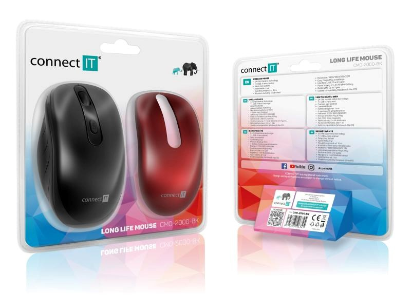 Bezdrátová optická myš s unikátní funkcí "Long Life", díky které můžete používat myš po celý rok bez potřeby výměny baterií. Myš také disponuje možností výměny krytu, díky které můžete střídat mezi černou a červenou barvou myši. Tichý chod tlačítek, které při klikání nevydávají žádný zvuk, najde své uplatnění všude tam, kde uživatel vyžaduje absolutní soukromí a klid. Design myši dovoluje uschovat USB-A Nano přijímač pod krytem myši a zabrání tak jeho ztrátě. Součástí balení je červený kryt a originální alkalická tužkové baterie CONNECT IT.