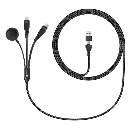 Univerzální nabíjecí kabel 6v1 pro nabíjení zařízení s konektory 1x USB-C, 1x Lightning a 1x nabíječka na chytré hodinky (kompatibilní s Apple Watch) se vstupním konektorem USB-C a redukcí na USB-A. Umožňuje nabíjení až tří zařízení současně s podporou rychlého nabíjení pomocí max. proudového toku 5 A. Speciální manžetová nadstavba konektorů zaručuje lepší přístupnost k nabíjecím zdířkám mobilních telefonů v pouzdrech.