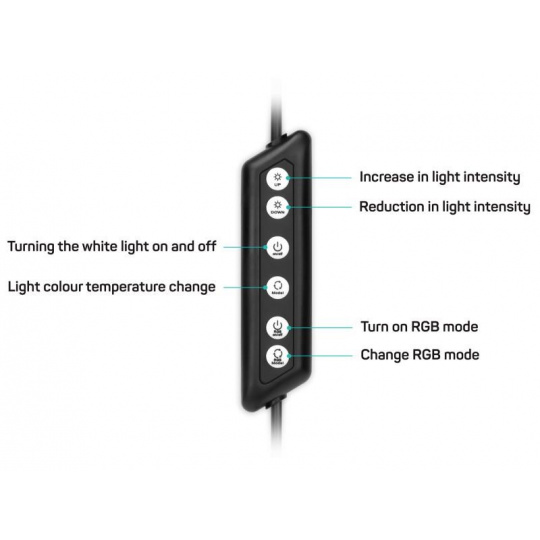 | Dálkové ovládání umožňuje |  - změnu intenzity světla v 9 úrovních - nastavení barevné teploty světla - celkové zapnutí a vypnutí světla - zapnutí a vypnutí RGB módu - změnu RGB světelných efektů  |