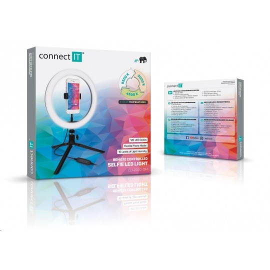 Kruhové selfie LED světlo "Selfie10Ring" s flexibilním držákem na mobilní telefon a stativem s kulovou hlavou pro domácí i profesionální použití umožňuje nastavit barevnou teplotu světla na 3 různé úrovně (3000/4500/6500 K). Součástí výbavy je dálkový ovladač na kabelu.
