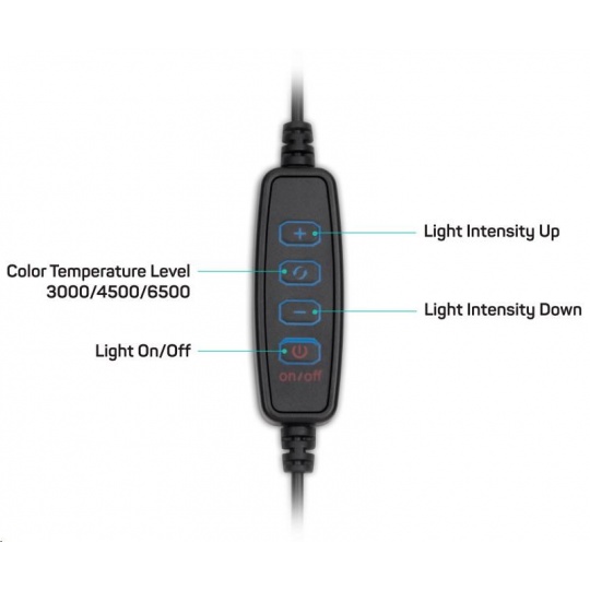 | Obsah balení | - Kruhové LED světlo - Přívodní kabel s dálkovým ovládáním - Flexibilní držák mobilního telefonu - Stativ s kulovou hlavou - Návod k obsluze |