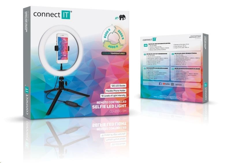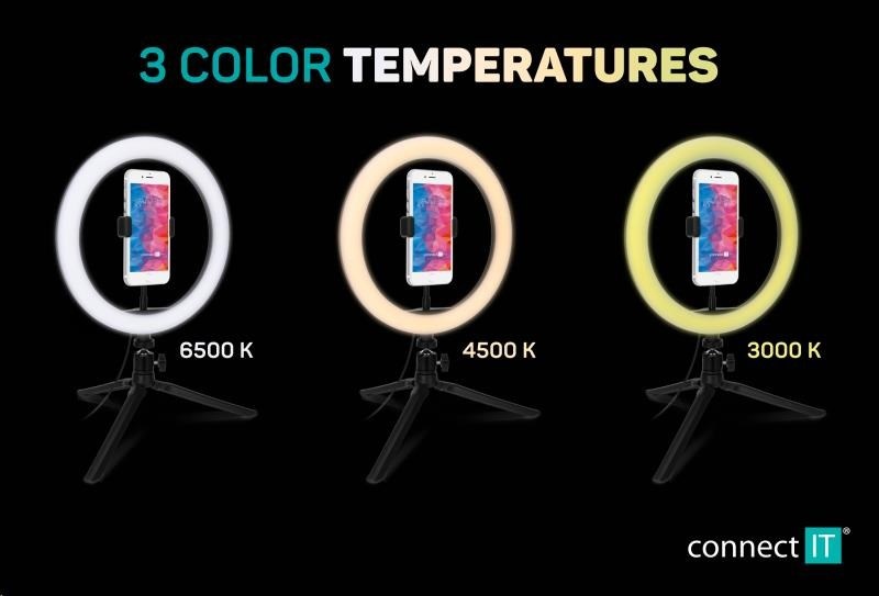 Kruhové selfie LED světlo "Selfie10Ring" s flexibilním držákem na mobilní telefon a stativem s kulovou hlavou pro domácí i profesionální použití umožňuje nastavit barevnou teplotu světla na 3 různé úrovně (3000/4500/6500 K). Součástí výbavy je dálkový ovladač na kabelu.