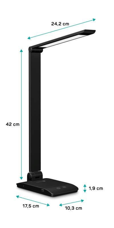 Díky sklopnému rameni a krku nastavíte dokonalý úhel pro jakoukoliv práci. Lampička disponuje USB-A výstupem s výkonem 5 W a dvěma praktickými dotykovými spínači, které umožňují zapnout/vypnout lampu, nastavit 3 úrovně jasu světla nebo nastavit barevnou teplotu světla ve 3 různých úrovních (3000/4000/6500 K).