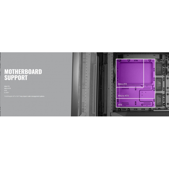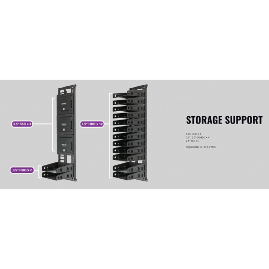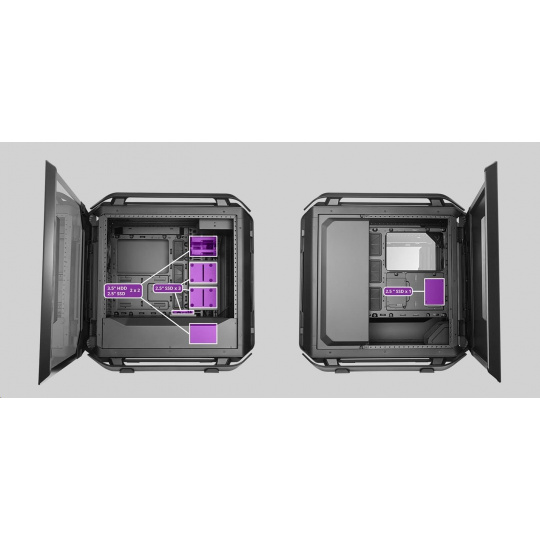Kryt PSU je modulární díky dvěma nezávislým dílům, zatímco systém krytu kabelů obsahuje 3 samostatné díly, z nichž každý umožňuje montáž úložiště nebo čerpadla pro kapalinové chlazení.
