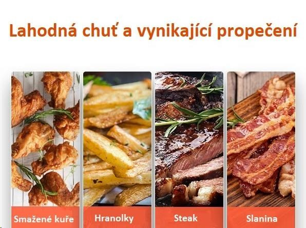 Horký vzduch rotuje kolem jídla ze všech stran a tím dosahuje kvalitního a rovnoměrného propečení a uvaření pokrmů. Díky této technologii se fritéza předehřeje během pouhých 5 minut.