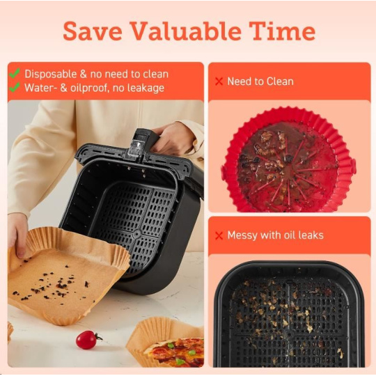 Čtvercové jednorázové pečicí papíry pro horkovzdušnou fritézu jsou koncipovány tak, aby odpovídaly tvaru koše fritézy, takže je nemusíte trhat ani stříhat. Když jste připraveni k vaření, jednoduše je vložte do koše.