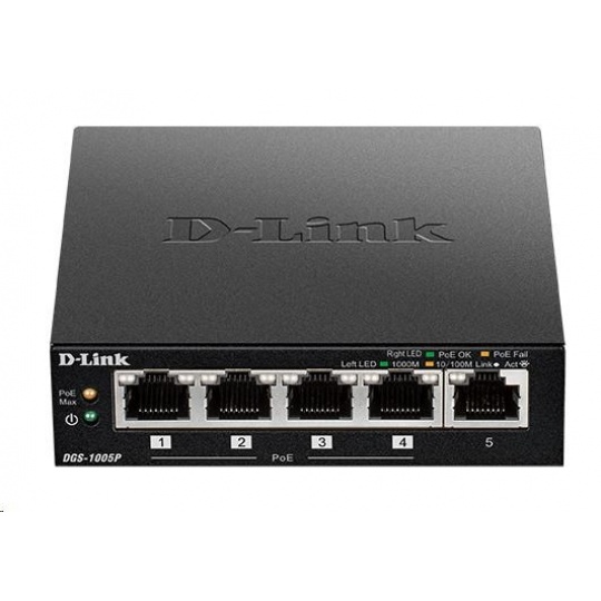 D-Link DGS-1005P 5-port Gigabit Desktop PoE+ Switch, 4 porty jsou PoE+, PoE budget 60W