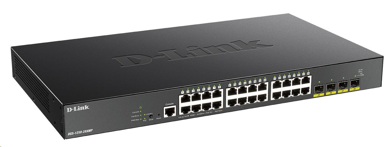 D-Link DGS-1250-28XMP 28-port Gigabit Smart PoE Switch, 24x GbE PoE+, 4x SFP+, PoE 370W