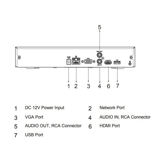 1× GbE RJ-45, 1× audio vstup (RCA), 1× audio výstup (RCA), 2× USB 2.0, pozice pro 1× SATA HDD (max. 16 TB/disk), 1× HDMI, 1× VGA.