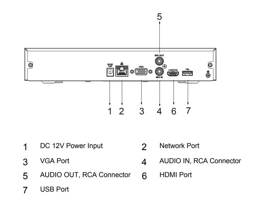1× GbE RJ-45, 1× audio vstup (RCA), 1× audio výstup (RCA), 2× USB 2.0, pozice pro 1× SATA HDD (max. 16 TB/disk), 1× HDMI, 1× VGA.