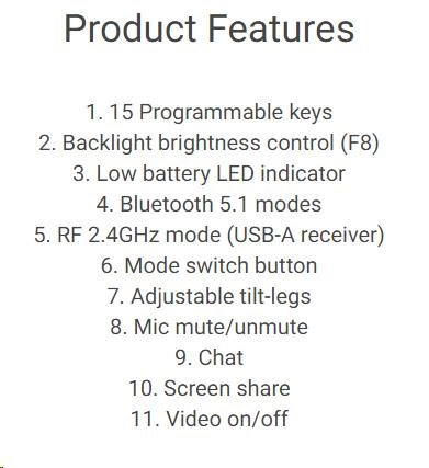 Rozhraní klávesnice:Bezdrátová; Lokalizace klávesnice:EN; Výbava klávesnice:Podsvícené klávesy.
