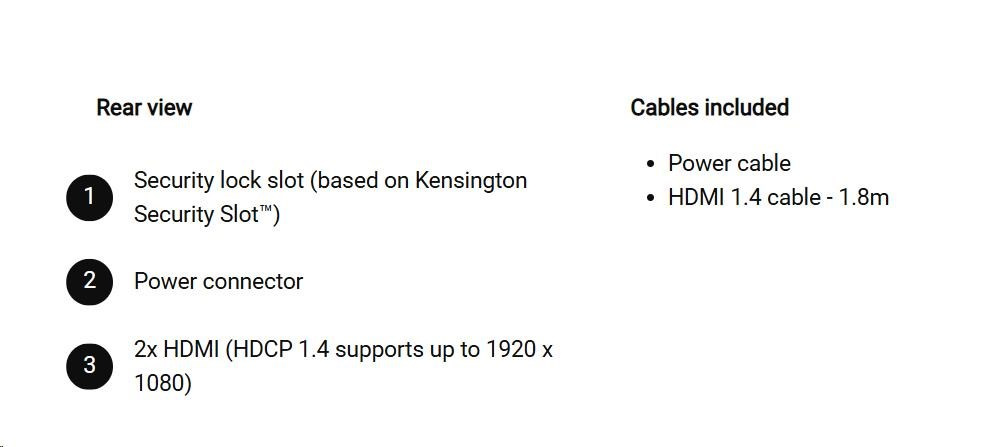 | 2 HDMI port (HDCP 1.4) (Support up to FHD 1920 x 1080 144 Hz as specified in HDMI 1.4) |