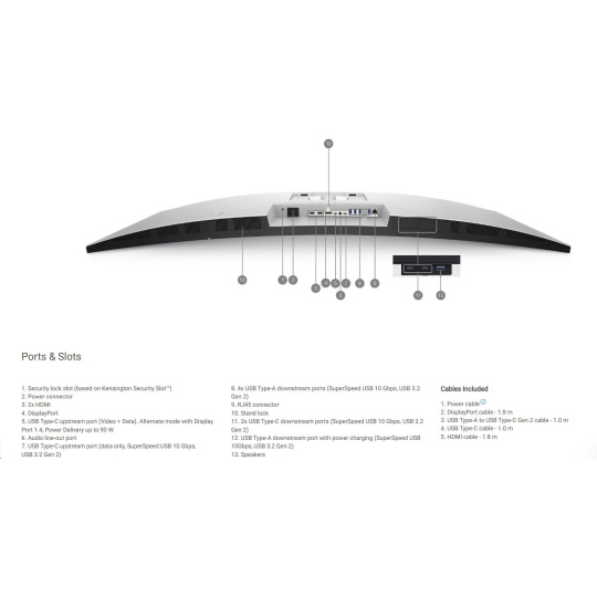 Rozlišení displeje:5120x1440; Úhlopříčka displeje ("):49; Výbava:Reproduktory, VESA montáž, Pivot, Nastavitelná výška, Dokování NTB; HDMI počet:2; DP počet:1; DP verze:1.4; Doba odezvy (ms):8; Formát obrazovky:32:9; Typ panelu:IPS; Jas (cd/m2):350; Kontrast:1:2000; Obnovovací frekvence displeje (Hz):60; VESA rozměry:100x100; Standardní záruka (roky):3.