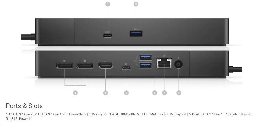 Počet DP portů:2; Počet HDMI portů:1; Počet VGA portů:0; Počet USB-C:2; Počet USB-A:3; LAN:1Gbps; Max. počet ext.monitorů:2; Audio:Combo; VESA podpora; PD (max.W):210.