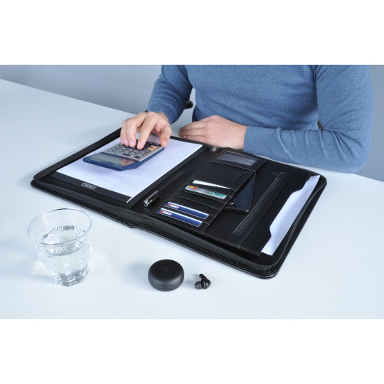 Tato Business Classy konferenční složka je ručně vyrobená z vysoce kvalitní syntetické kůže v minimalistickém designu. ? 13 kapes a přihrádek – ideální pro pera, vizitky a dokumenty ? Speciální kapsa na tablet (lze použít i pro dokumenty formátu A4) ? Uzavíratelná kapsa na zip pro bezpečné uložení cenností ? 8 slotů n... více