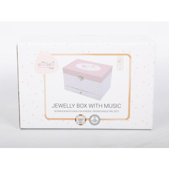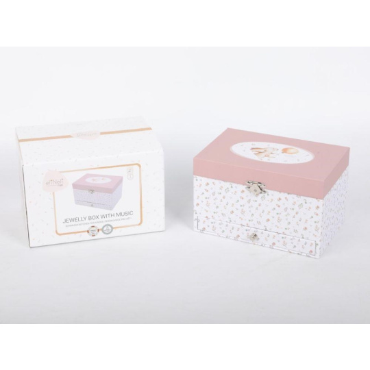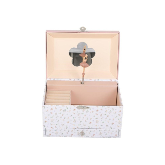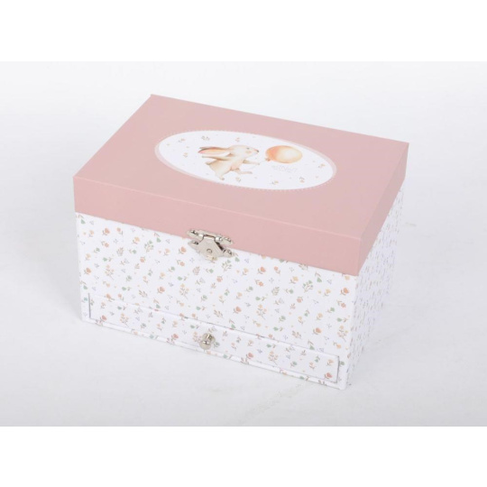 Dětská šperkovnice zdobená drobnými květy, s roztomilým zajíčkem na víku, okouzlí každou malou parádnici. Šperkovnice pro děti, s členěným vnitřním prostorem a praktickou zásuvkou ve spodní části nabízí dostatek místa pro uložení prstýnků, dívčích šperků, drobných pokladů. Uvnitř šperkovnice se ukrývá nejen zrcátko, ale i něžná baletka, která vaší holčičce ráda zatančí..