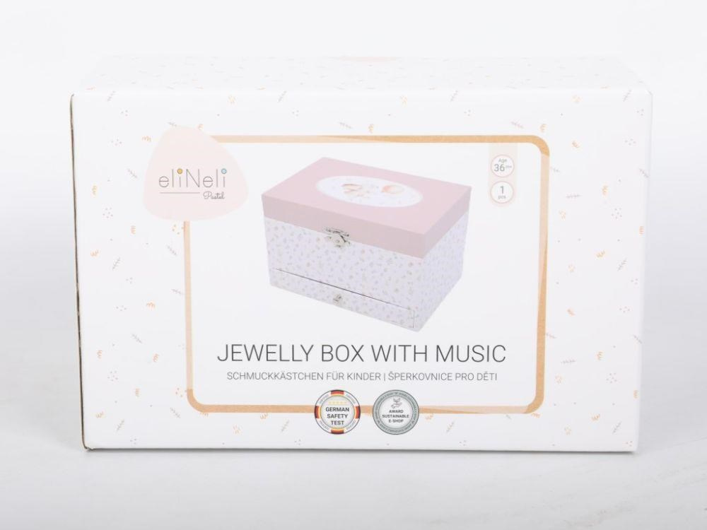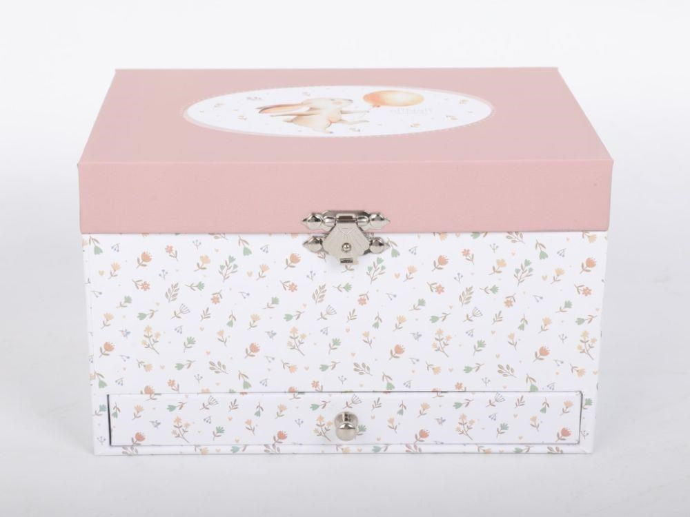 Dětská šperkovnice zdobená drobnými květy, s roztomilým zajíčkem na víku, okouzlí každou malou parádnici. Šperkovnice pro děti, s členěným vnitřním prostorem a praktickou zásuvkou ve spodní části nabízí dostatek místa pro uložení prstýnků, dívčích šperků, drobných pokladů. Uvnitř šperkovnice se ukrývá nejen zrcátko, ale i něžná baletka, která vaší holčičce ráda zatančí..