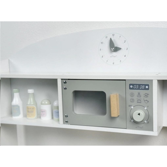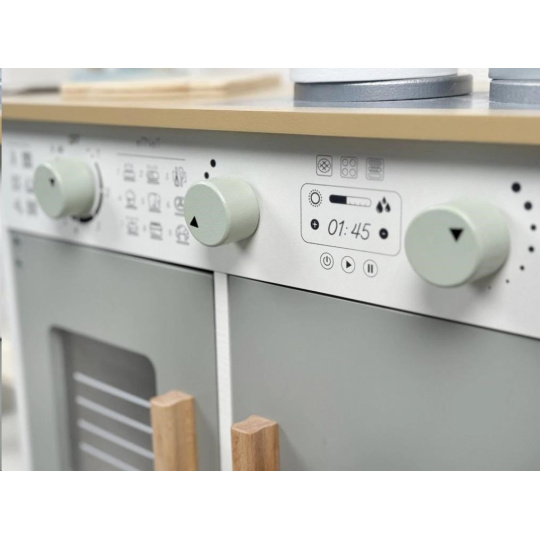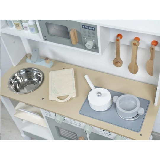 Dřevěná dětská kuchyňka v neutrální barevné kombinaci bílé a šedé barvy, doplněná bohatým příslušenstvím, je místem, kde vaše dítko může popustit uzdu své fantazii a kreativitě. Dětská kuchyňka se spotřebiči i nádobím je edukativní hračkou, která umožní dětem vyzkoušet si vaření, pečení a ostatní dospělácké činnosti bezpečným dětským způsobem. Díky přídavným nožkám (nástavcům) můžete kuchyňku zvednout o 6 cm.