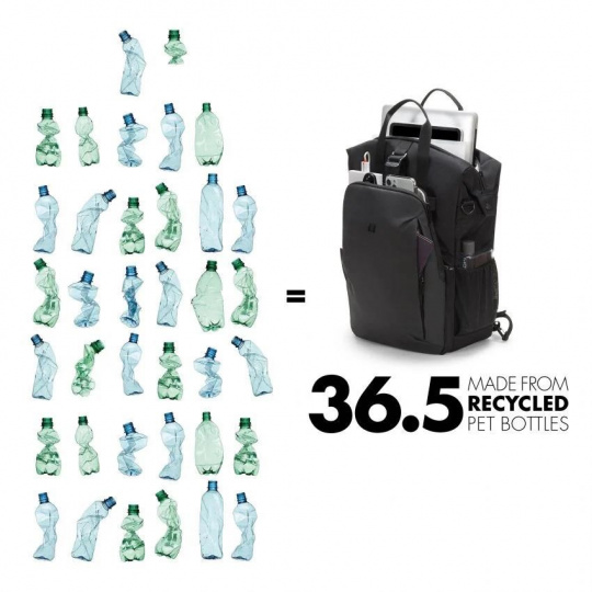 Characteristics • Made of 36.4 recycled PET bottles • Padded notebook compartment with fitall system • Slip pocket for tablets up to 12.9" • Spacious main section with compartments for documents and accessories • Front pocket with storage space for mobile accessories • Open expandable compartment for active gear • Extension zipper for more storage space • Padded, removable shoulder straps to wear as backpack
