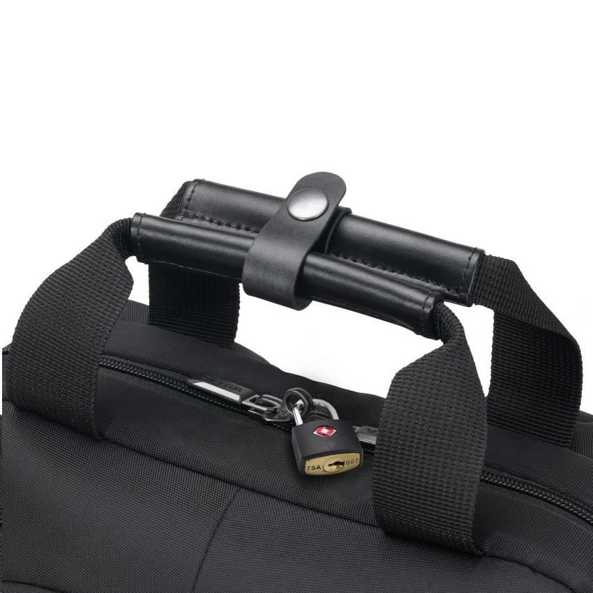 The lockable notebook compartment is equipped with memory foam and automatically adjusts to laptops in sizes from 12 to14.1 inches thanks to the fit-all system. Optimal hold is provided by the anti-slip technology coating, which prevents the device from slipping out of the backpack. Best protection for tablets up to 12.9 inches. The front pocket with key ring and pockets keeps your personal items tidy and has room for additional mobile accessories. Maximum carrying comfort thanks to ergonomic back padding, length-adjustable shoulder straps, comfortably shaped carrying handle and trolley fastening strap. Hidden zipped pocket on the back to safely store passport, wallet or other valuables. Side pockets for storing an umbrella or water bottle. The bottom of the bag is made from waterproof material.