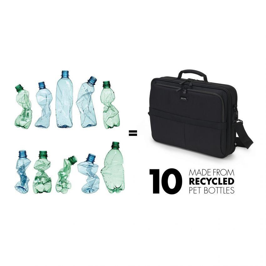 Laptop Bag Eco Multi Plus SCALE 14-15.6" A light notebook case with protective padding and lots of storage space Today's actions shape tomorrow's world. Which is why, here at DICOTA, we are dedicated to developing environmentally friendly solutions and therefore make all the items in our ECO collections out of sustainable, recycled PET. We reuse up to 45 PET bottles, so you will receive an environmentally friendly product with a life-long guarantee. Our PET products also have the quality, look and finish that you know and love. Specifications Art.no.: D31439-RPET EAN: 7640158666388 Weight: 0.95 kg Material: 600D recycled PET Warranty: Lifetime / 30 years Dimension: 415 x 310 x 85 mm Max. Device dimensions: 385 x 265 x 35 mm Characteristics • Made of 10 recycled PET bottles • Lockable and highly padded laptop compartment • Metal frame for extra protection • Surrounding High-Density Foam as protective padding • Reliable fastening thanks to fastening strap and adjustable divider • Slip pocket for tablets measuring up to 12.9" • Front pocket with functional compartments for mobile accessories • Additional zippered document compartment on the back of the bag.