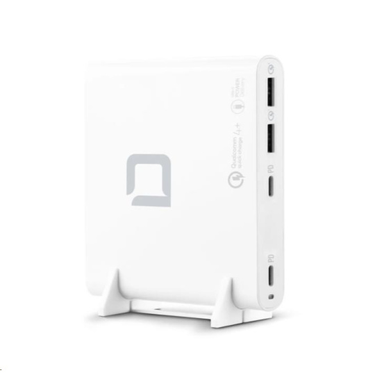Nabíječku lze používat ve více než 180 zemích a je vybavena dvěma výstupy USB-C s technologií Power Delivery 3.0 a dvěma porty USB-A s technologií Qualcomm Quick Charge 4.0+. Maximální výkon nabíjecí stanice je 120 W. Výstupní napětí (5 - 20 V) a nabíjecí proud (až 5 A) se automaticky přizpůsobují připojeným zařízením. Inteligentní řídicí systém šetří baterii a zároveň nabízí spolehlivou ochranu proti nadproudu, přepětí, zkratu a přehřátí. Elegantní design, kompaktní tvar a hmotnost pouhých 240 gramů - ideální společník pro rychlé a efektivní získávání energie doma, v kanceláři nebo na cestách. Součástí je plastový stojánek, který zabraňuje přehřátí.