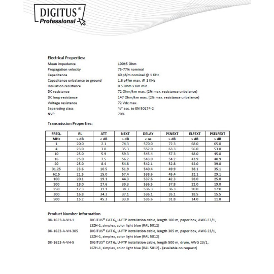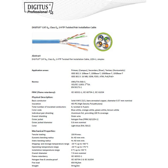 DIGITUS CAT 6A U-FTP Kabel 4x2,drát AWG23, LSOH, modrý, 305m - 4x2 AWG23 drát, čístá měď - Kategorie CAT6A vyhovuje normě ISO/IEC 11801, TIA/-586-C.2, EN 50173 - Nejvyšší podporovaný protokol: 1000BaseT, Gigabit Ethernet - 500MHz - Barevně odlišené žíly - Páry jsou jednotlivě stíněny hliníkovou folií - Celek je nestíněný - Izolace: SFS-PE - Plášť: LSOH - NVP: 70% - Zatížení: 150N max. - Dynamický radius v ohybu: 8x AD mm min. - Static bending radius: 4x AD mm min. - Skladovací teplota: -20°C až 60°C - Teplota při instalaci: 0°C až 50°C - Barva pláště: světle modrá - Délka kabelu v balení:305m na dřevěné cívce Instalační kabel CAT6A zaručuje dlouhou životnost, maximální výkon a bezproblémový chod počítačové sítě. Instalační kabel - CAT6A je určený pro horizontální rozvody a bez problémů splňuje požadavky definované v mezinárodních standardech ISO/IEC 11801, TIA/-586-C.2, EN 50173 pro CAT6A a je proto vhodný i pro provoz těch nejnáročnějších protokolů určených pro strukturovanou kabeláž. e proto vhodný i pro provoz těch nejnáročnějších protokolů určených pro strukturovanou kabeláž..