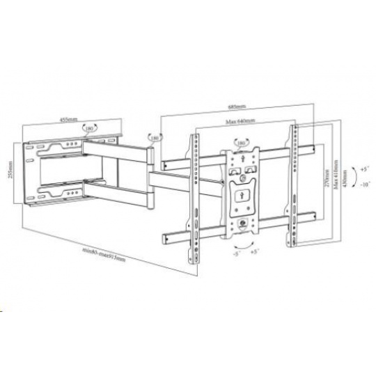Dlouhý otočný držák na televize Ergosolid ONYX-20    Výborný držák s délkou 80-915mm a možností otočit Tv 70" kolmo ke zdi na obě strany     Kvalitní nástěnný držák pro zavěšení televizorů s úhlopříčkou 43" až 75", televizory s úhlopříčkou do 70" lze na držáku otáčet kolmo ke zdi na obě strany. Konstrukce držáku je ocelová a zajiští bezpečné a spolehlivé zavěšení televizorů, které mají hmotnost až 45kg. Televizi lze nejen otáčet do stran, ale i naklápět nahoru nebo dolů a měnit vzdálenost od zdi. V případě nepřesné instalace nebo nerovností držák umožňuje korekci až +/- 5°.  Podporuje VESA standardy 200x100 až 600x400. Barevné provedení černé, záruka 3 roky.     Extra dlouhý držák na Tv pro otáčení Tv až 70" kolmo ke zdi - ergosolid onyx20     Technické údaje:   nosnost 45kg VESA standardy 200x100 až 600x400 na televize 43" až 75" otáčení Tv do stran +/- 90° Tv s úhlopříčkou do 70" lze otočit i kolmo ke zdi na obě strany vzdálenost Tv od zdi 80-915mm náklon +5° / -10° korekce roviny +/- 5° kvalitní ocelová konstrukce bezpečný a spolehlivý držák balení obsahuje sadu instalačního materiálu barva černá záruka 3 roky.