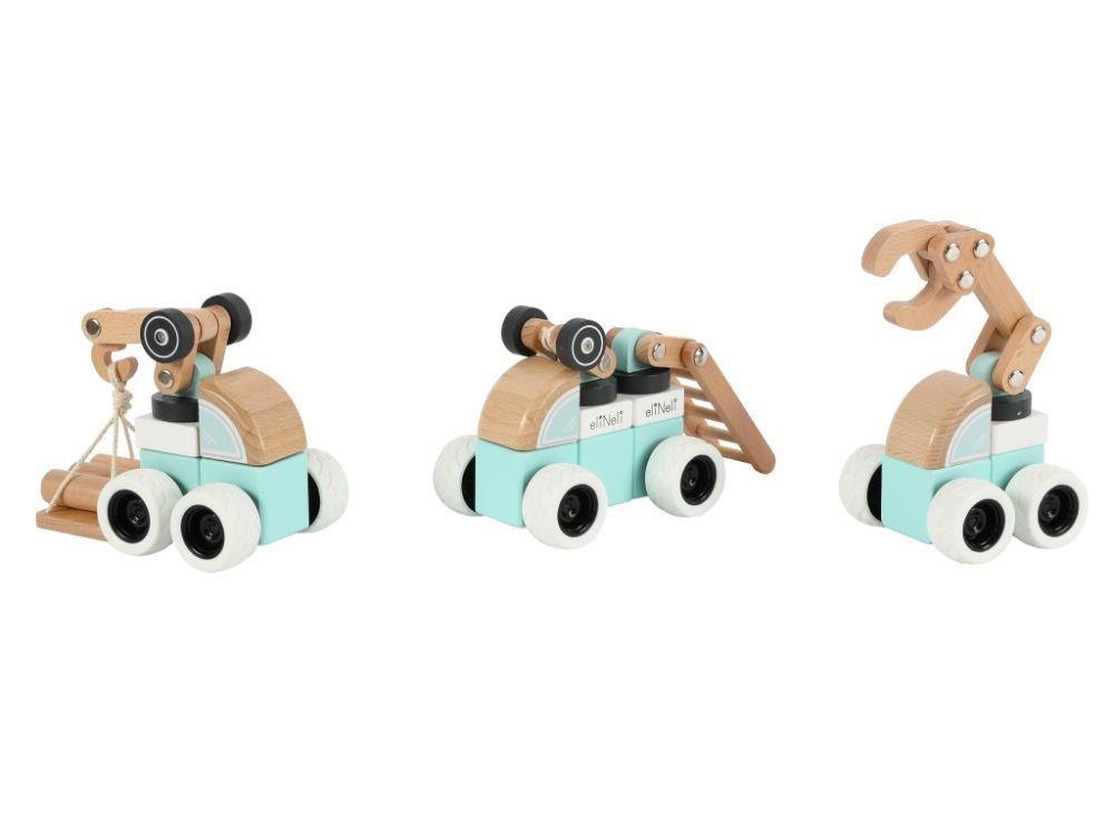 Sada dřevěných aut (strojů) nabízí spoustu možností ke hře. Každé auto je sestavené z kostek v barvě bílé, mátové nebo barvě přírodního dřeva a každé z aut obsahuje pohyblivou část (pohyblivé rameno nebo žebřík) pro ještě více zábavy. Auta jsou vyrobená tak, aby dobře padla do dětské ruky, pohodlně se držela a snadno se s nimi manipulovalo. Gumová kola tlumí hluk a šetří podlahu..