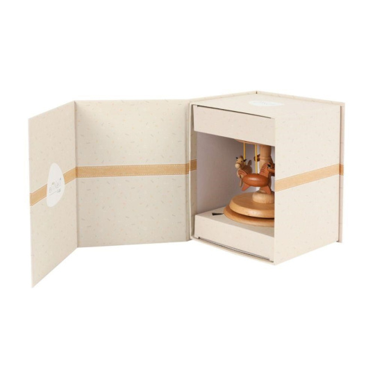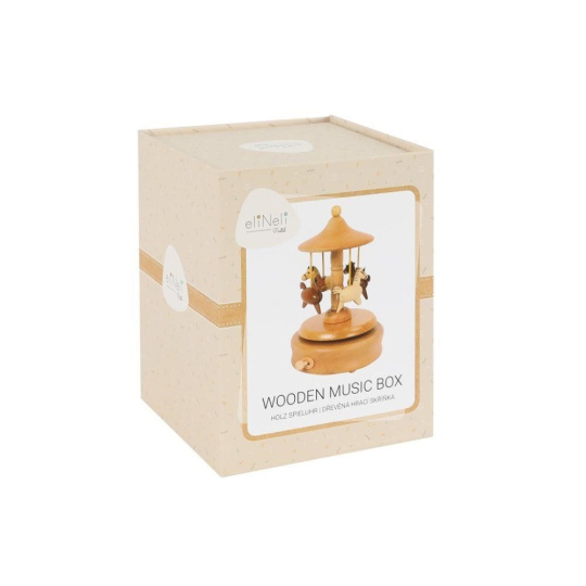Dřevěná hrací skříňka s koníky je hudební hračkou i krásnou dekorací. Hrající kolotoč s koníky, kteří se točí dokolečka, je vyrobený z přírodního dřeva, jeho povrch je dohladka opracovaný, příjemný na dotek. Dřevěná skříňka potěší každou malou i velkou milovnici koní, je krásnou dekorací na polici, stůl, krásným dárkem k jakékoliv příležitosti..