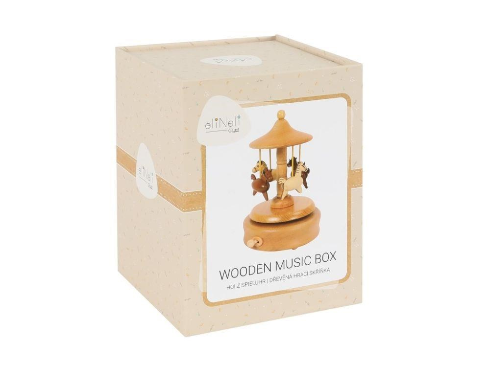 Dřevěná hrací skříňka s koníky je hudební hračkou i krásnou dekorací. Hrající kolotoč s koníky, kteří se točí dokolečka, je vyrobený z přírodního dřeva, jeho povrch je dohladka opracovaný, příjemný na dotek. Dřevěná skříňka potěší každou malou i velkou milovnici koní, je krásnou dekorací na polici, stůl, krásným dárkem k jakékoliv příležitosti..