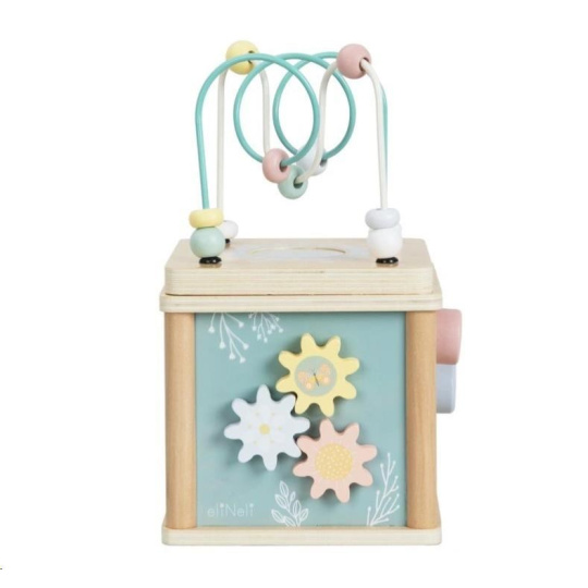 Dřevěná activity cube (kostka) se zvířátky si pro děti připravila spoustu aktivit, které potrénují a zdokonalí dětské dovednosti. Aktivity kostka vyrobená z masivního dřeva, překližky a MDF nabízí spoustu možností ke hře. Samotné víko (vrchní stranu) dřevěné kostky představuje zábavné bludiště v pastelových barvách, které dětem se svými zakroucenými drátky a dřevěnými korálky trochu zamotá hlavu. Jedna ze stran je vkládačkou, druhá bludištěm, třetí rozkvetlou loukou s květinami v podobě ozubených koleček a čtvrtá zábavnou hrou s otočnými destičkami.