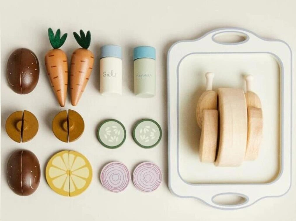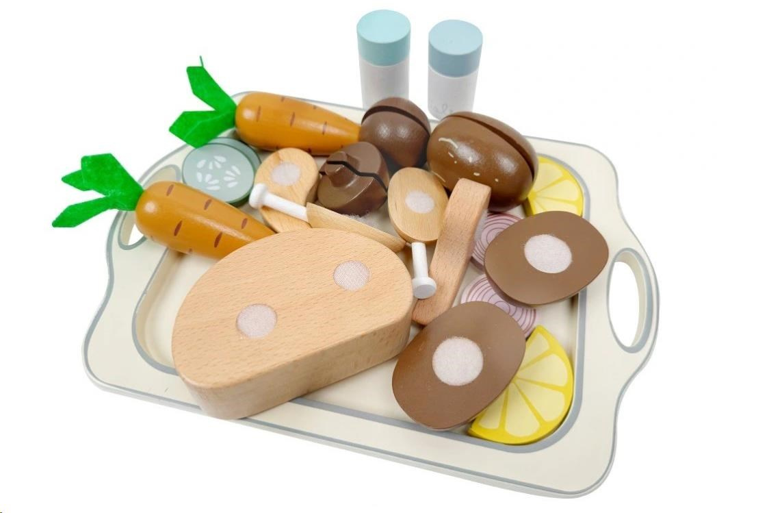 Dřevěné potraviny, zelenina, kuře, solnička s pepřenkou a velký tác usnadní dětem vaření a pečení v dětské kuchyňce. S touto dřevěnou sadou krájecích potravin bude pečení kuřete zábavnou hrou. Stačí ke kuřeti přidat oblíbenou zeleninu a potraviny, osolit, opepřit a vložit kuře do trouby. Upečené dřevěné kuře s oblohou na dřevěném tácu vypadá opravdu lahodně a je k nakousnutí.