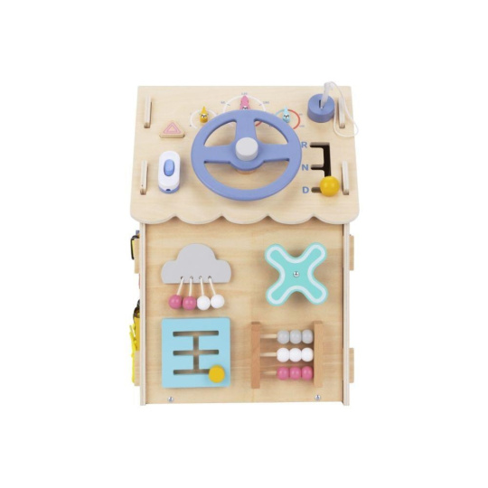Domeček activity board v přírodním (natur) provedení, s montessori a hracími prvky, s volantem a dalšími zajímavými doplňky láká děti k prozkoumání, ke hře a k učení se. Dřevěný activity board domeček je hračkou i výukovou pomůckou. Při hře děti přirozeným způsobem zdokonalují své dovednosti, učí se novým a užijí si spoustu zábavy..