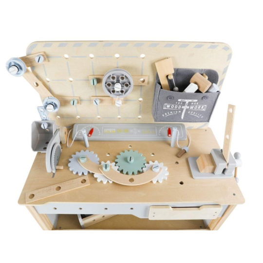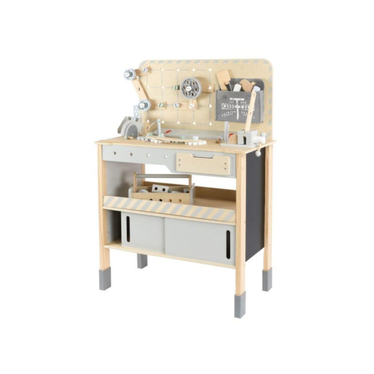 Dětský dřevěný ponk XXL se spoustou příslušenství, parádním jeřábem a opaskem na nářadí ZDARMA nadchne každého malého kutila. Dětský ponk v kombinaci šedé barvy s barvou přírodního dřeva, s jeřábem, nářadím, šrouby, destičkami a hlavně se spoustou vychytávek potrénuje jemnou motoriku, manuální zručnost, koordinaci očí a rukou, rozvíjí kreativitu, učí děti soustředit se a trpělivosti..