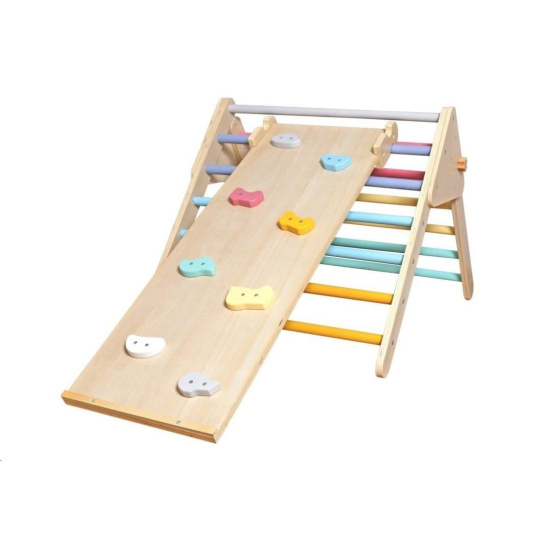 Krásná a zároveň praktická hrací sestava vyrobená z kvalitního přírodního dřeva je hračkou i sportovní pomůckou pro aktivní děti. Díky malému domácímu hřišti, jehož součástí je prolézačka ve tvaru trojúhelníku - s barevnými příčkami a oboustranné prkno, si děti užijí spoustu zábavy a zdravého pohybu i za nepříznivého počasí, klidně přímo v jejich dětském pokoji.