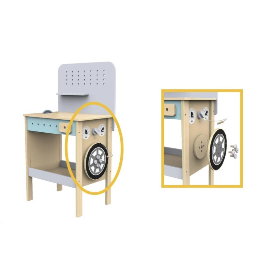 Originální dřevěný ponk se spoustou příslušenství a s kompresorem nadchne každého malého kutila. Dětský ponk v jemných pastelových barvách s nářadím, šrouby, matkami a hlavně se spoustou vychytávek potrénuje jemnou motoriku, manuální zručnost, koordinaci očí a rukou, rozvíjí kreativitu, učí děti soustředit se a trpělivosti.