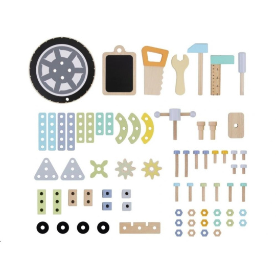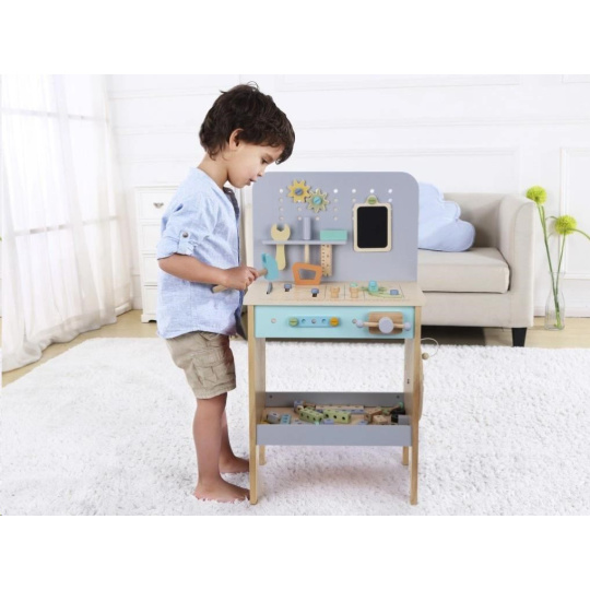 Dětský dřevěný ponk v jemných pastelových barvách nadchne děti i dospělé svým nadstandardním vybavením. Mimo klasického kutilského nářadí je jeho součástí i kotoučová pila, svěrák a dokonce kompresor. Bohaté příslušenství a různé vychytávky jsou zárukou zábavné hry na kutila, která u děti zdokonalí jejich dovednosti a naučí je novým.