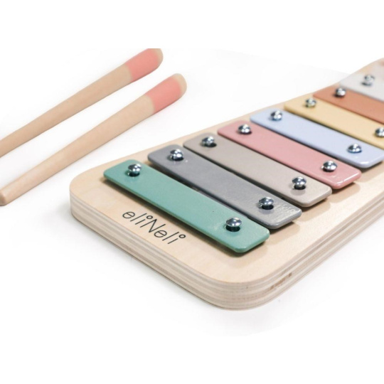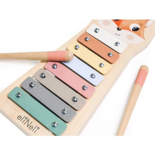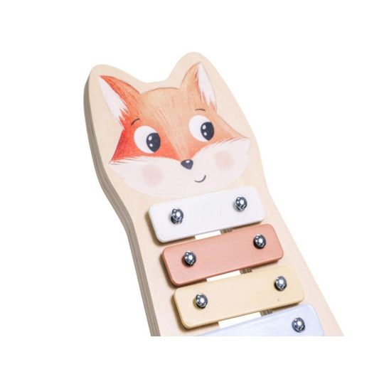Roztomilý dřevěný xylofon s motivem lišky okouzlí děti jemnými pastelovými barvami. Kovové destičky na liščím bříšku se při úderech dřevěnou paličkou (součástí balení jsou 2 paličky) rozezní a přenesou malé hudebníky do světa tónů a barev hravou a zábavnou formou.